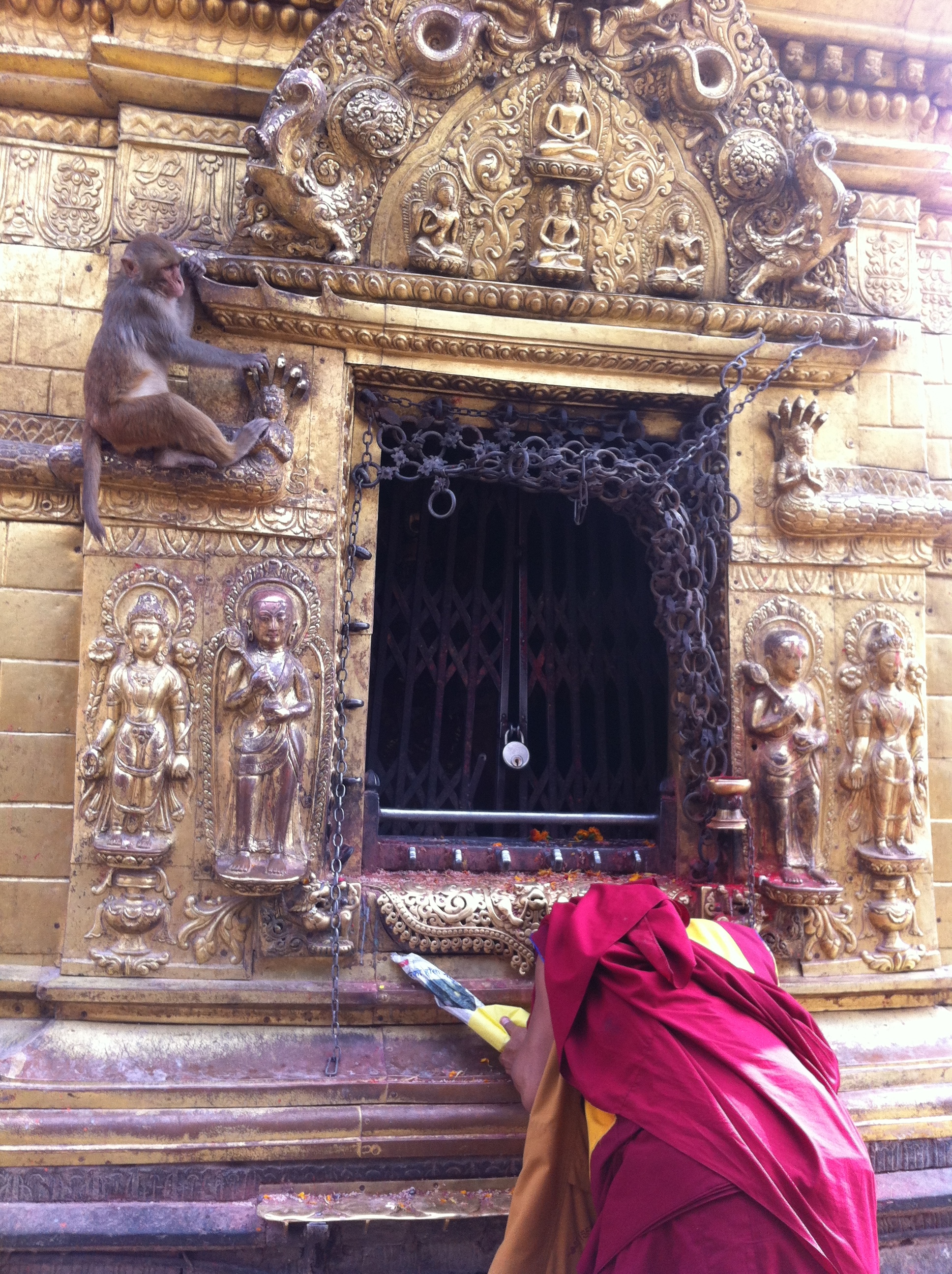 Eski sarayın fil ahırlarından dönüştürülen şık bir yerde bir sanat galerisine uğrayıp Swayambunath’a gideceğiz. Katmandu’nun en hikayeli Budist tapınağı maymunlu tapınak Swayambunath’a çıkıyoruz. Şehre yukarıdan bakıyoruz, Swayambunath’ı hacılarla birlikte tavaf ettikten sonra çayımızı içiyoruz. Hinduizmin bilgelik, öğrenme ve edebiyat tanrıçası Saraswati’nin tapınağına gidiyoruz.